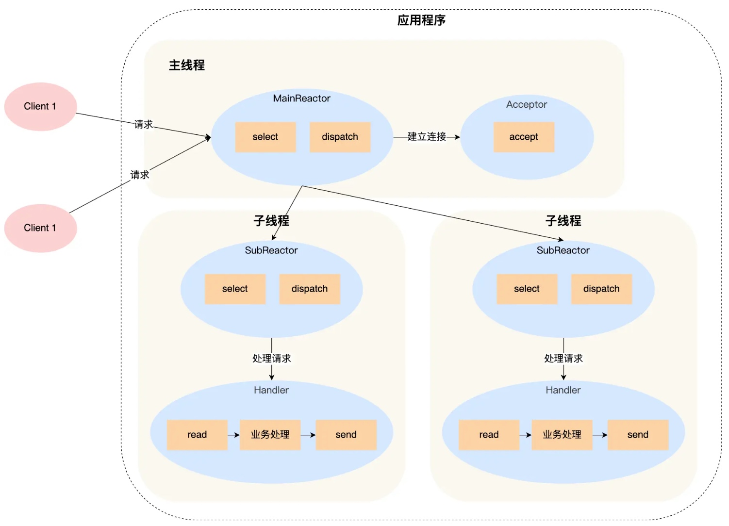 Reactor 主线程 MainReactor 对象通过select监听「连接」事件,收到事件后通过 Acceptor 处理连接事件,进而 MainReactor 将连接分配给 SubReactor,subReactor 对象将连接加入到 select 继续进行监听,并创建 handler 进行事件处理;每当有新事件发生,subreactor 就调用对应的 handler 处理,handler 通过 read->业务处理->send 完成业务流程。