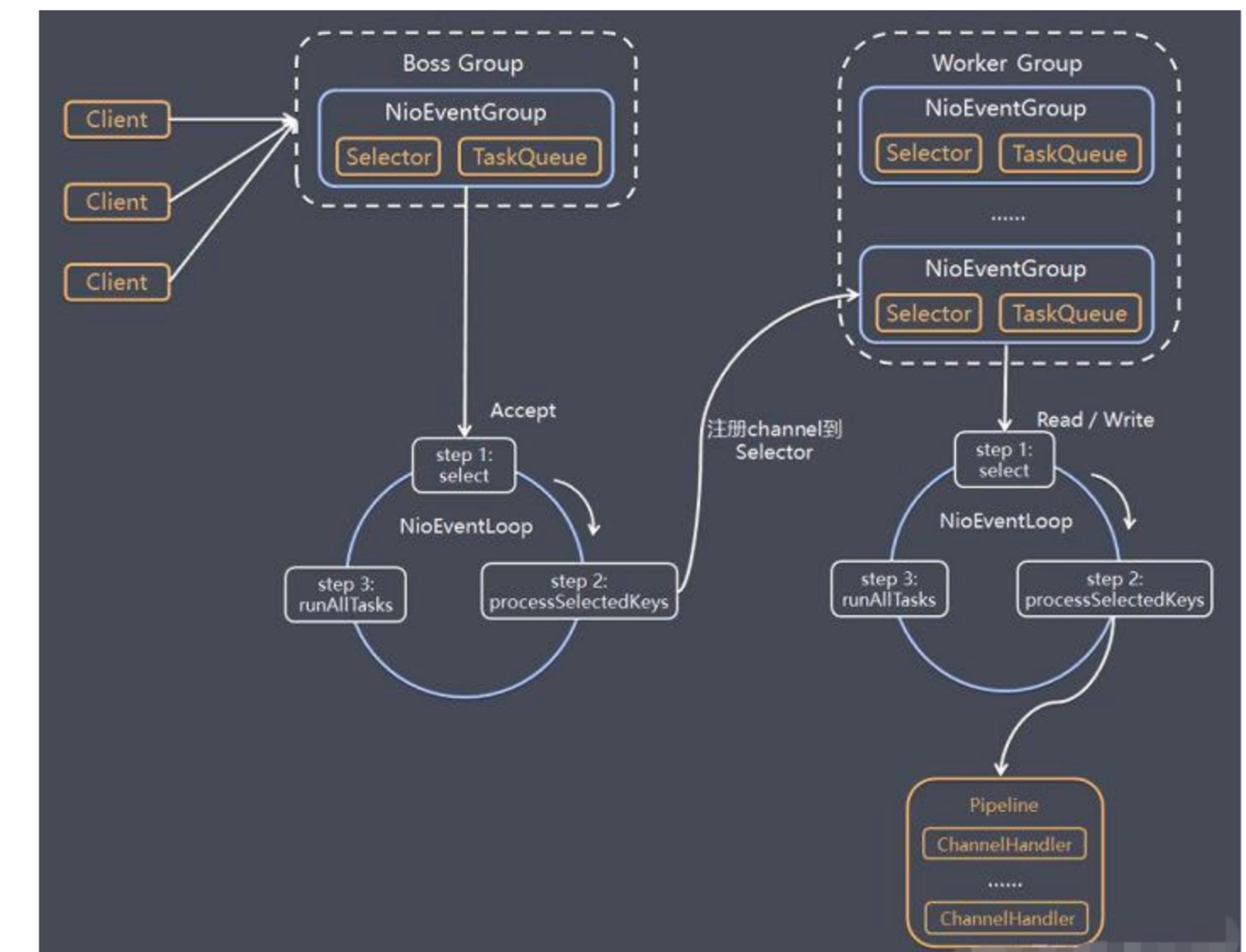 通常一个服务端口 ServerSocketChannel 对应一个 Selector 和一个 EventLoop 线程,BossEventLoop 负责接收客户端的连接并将 SocketChannel 交给 WorkerEventLoopGroup 进行 IO 处理,EventLoopGroup 提供