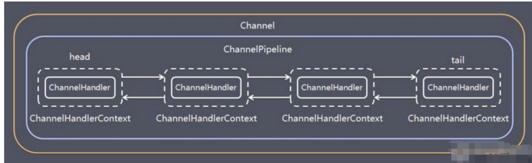 一个 Channel 包含了一个 ChannelPipeline,而 ChannelPipeline 又维护了一个由 ChannelHandlerContext 组成的双向链表,每个 context 中又关联着一个 ChannelHandler。